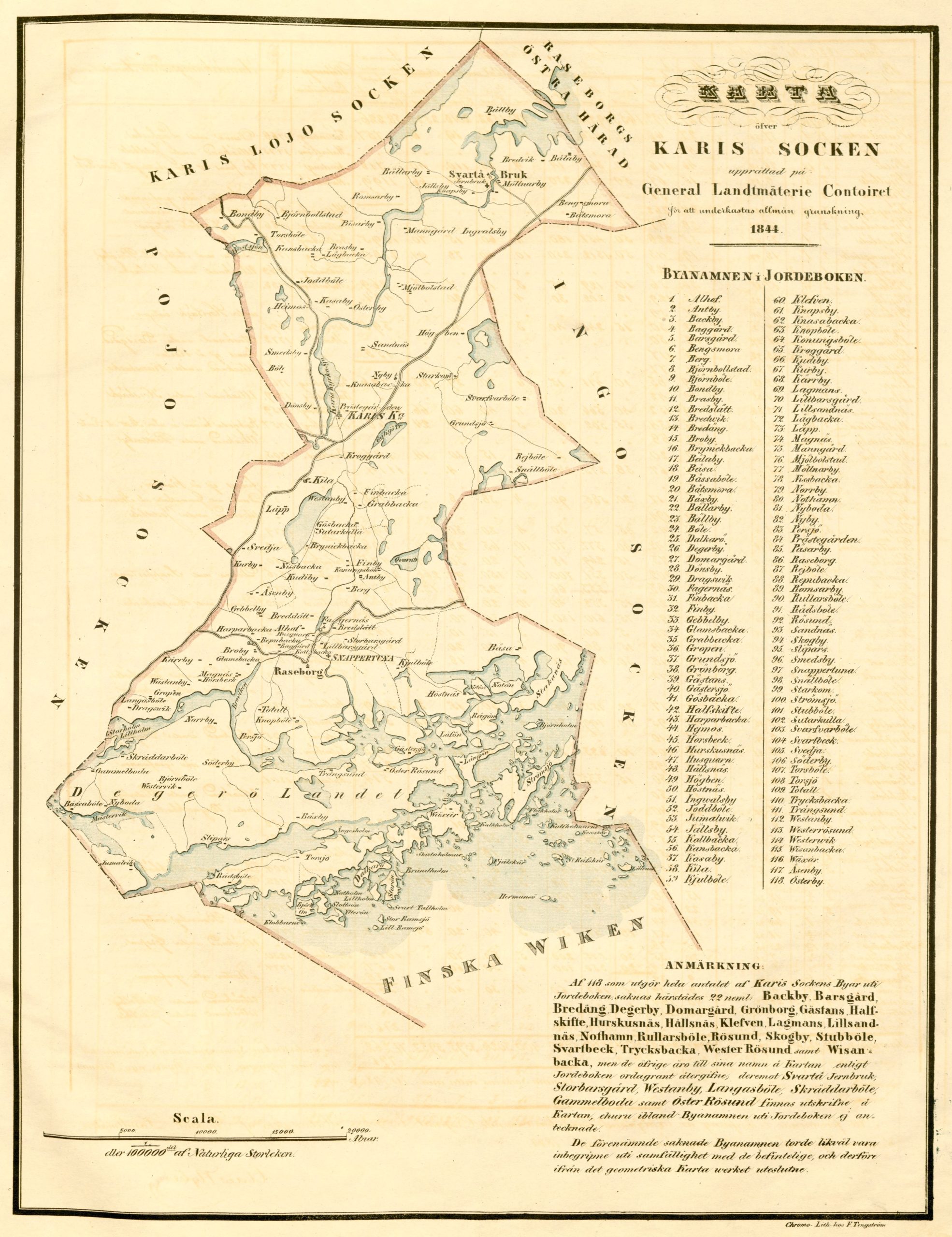 1635 Tenala-Pojo-Karis Kartor uppgjorda 1844 med socknarnas gränser sedan 1600-talet.Kartorna här har laddats ner från Wikimedia Commons. Filerna har komprimerats till ca 2 MB från originalens ca 10 MB.
