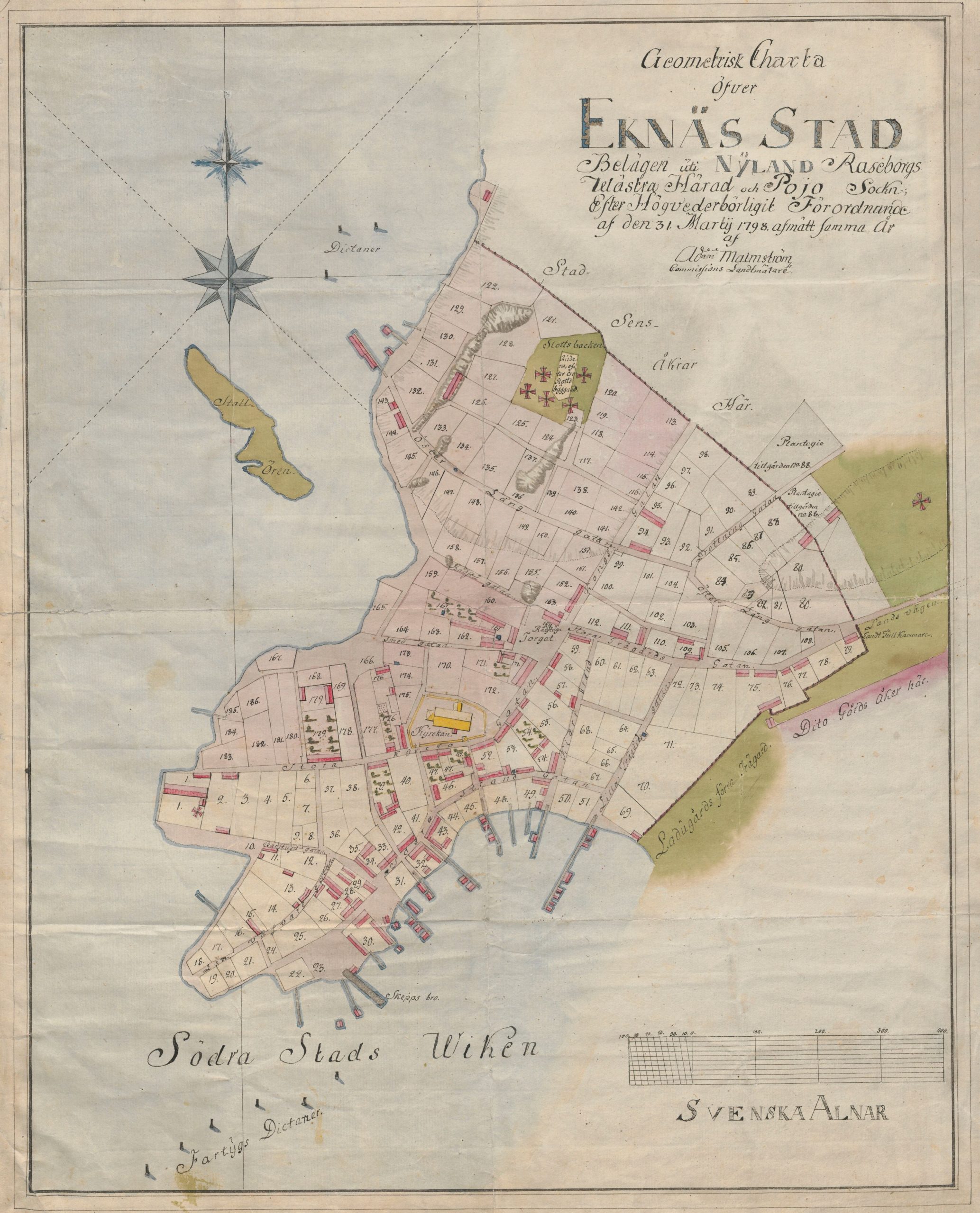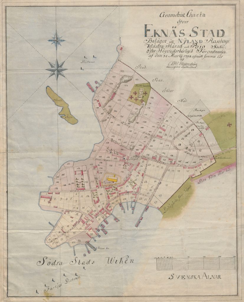 Kommissionslantmätaren Adam Malmströms geometriska karta uppgjord i slutet av 1700-talet är den äldsta där befintliga byggnader är inritade. Bebyggelsen är tätast kring torget och mellan kyrkan och södra viken. Gatorna har fått namn och tomter numrerats. Längs södra vikens strand finns många bryggor med båthus. Stallören är ännu en skild holme och på Slottsbacken finns flera väderkvarnar.