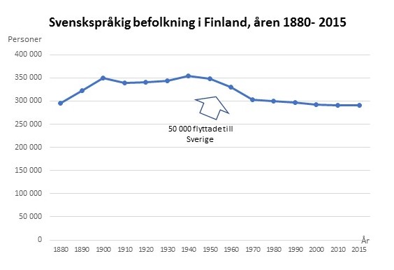 Det finns befolkningsstatistik med indelning enligt medborgarnas språk från och med år 1880. Då registrerades 295 000 personer med svenska som huvudspråk. Antalet var störst, 354 000 år 1940. Därefter minskade antalet snabbt framför allt på grund av emigrationen till Sverige. Antalet svenskspråkiga finländare som flyttade till Sverige på 1950, -60 och -70-talen uppskattas till 50 000 personer.